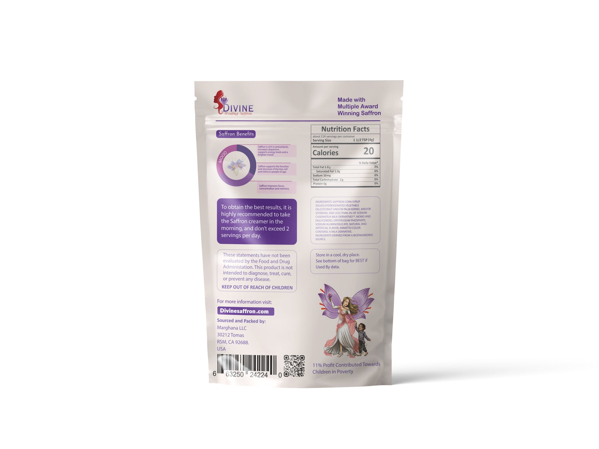 Crafted under GMP manufacturing standards for purity and consistency, every pouch delivers both luxury and trust. With 114 servings per 16.2 oz resealable bag, Divine Saffron Creamer is long-lasting, safe for families, and made to support your lifestyle with clean, plant-based ingredients.